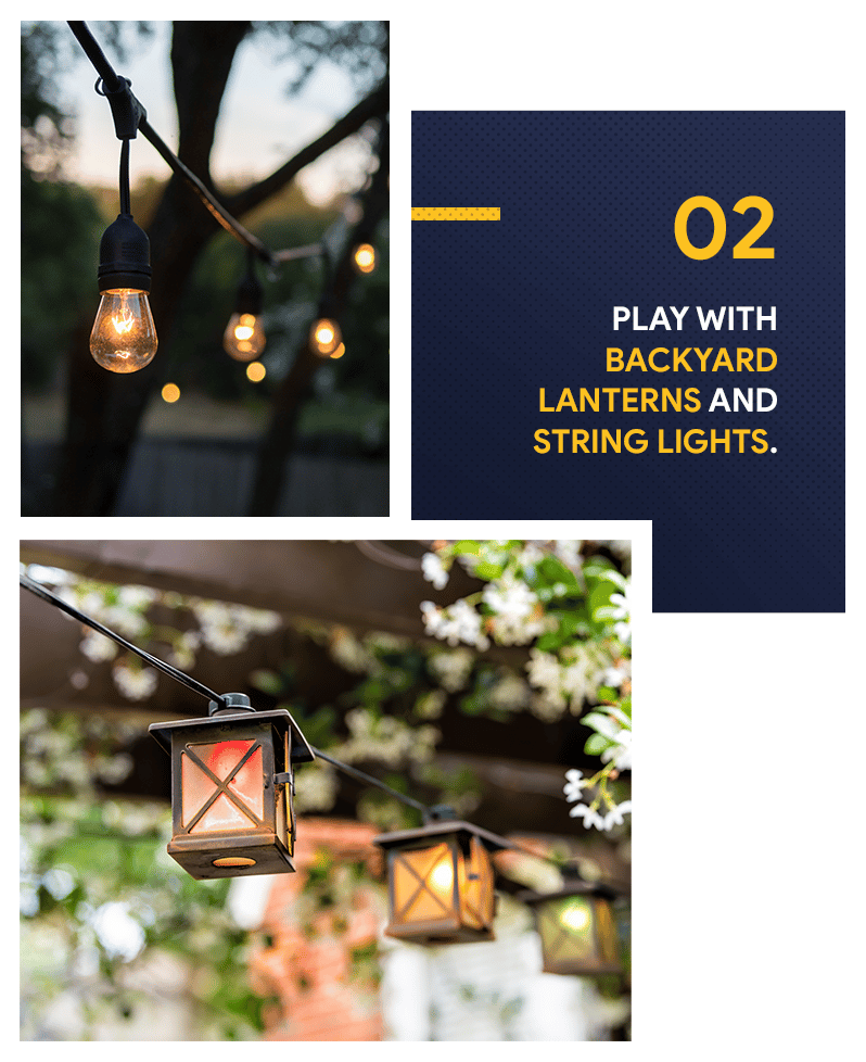 One way to embrace outdoor living and make your space an extension of your living room is to invest in additional lighting. Luminous decorations, such as floor or table lamps and lanterns, will not only brighten up your backyard but will also add interest to it. Just make sure to choose lamps that are designed for the outdoors and are weatherproof. Another brilliant idea is hanging pretty string lights across an entire space or along a fence to give your yard a rustic vibe.